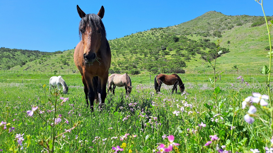 Wild horses enjoying spring weather at RTF’s Lompoc sanctuary. Photo by JaeHyeon Choi.