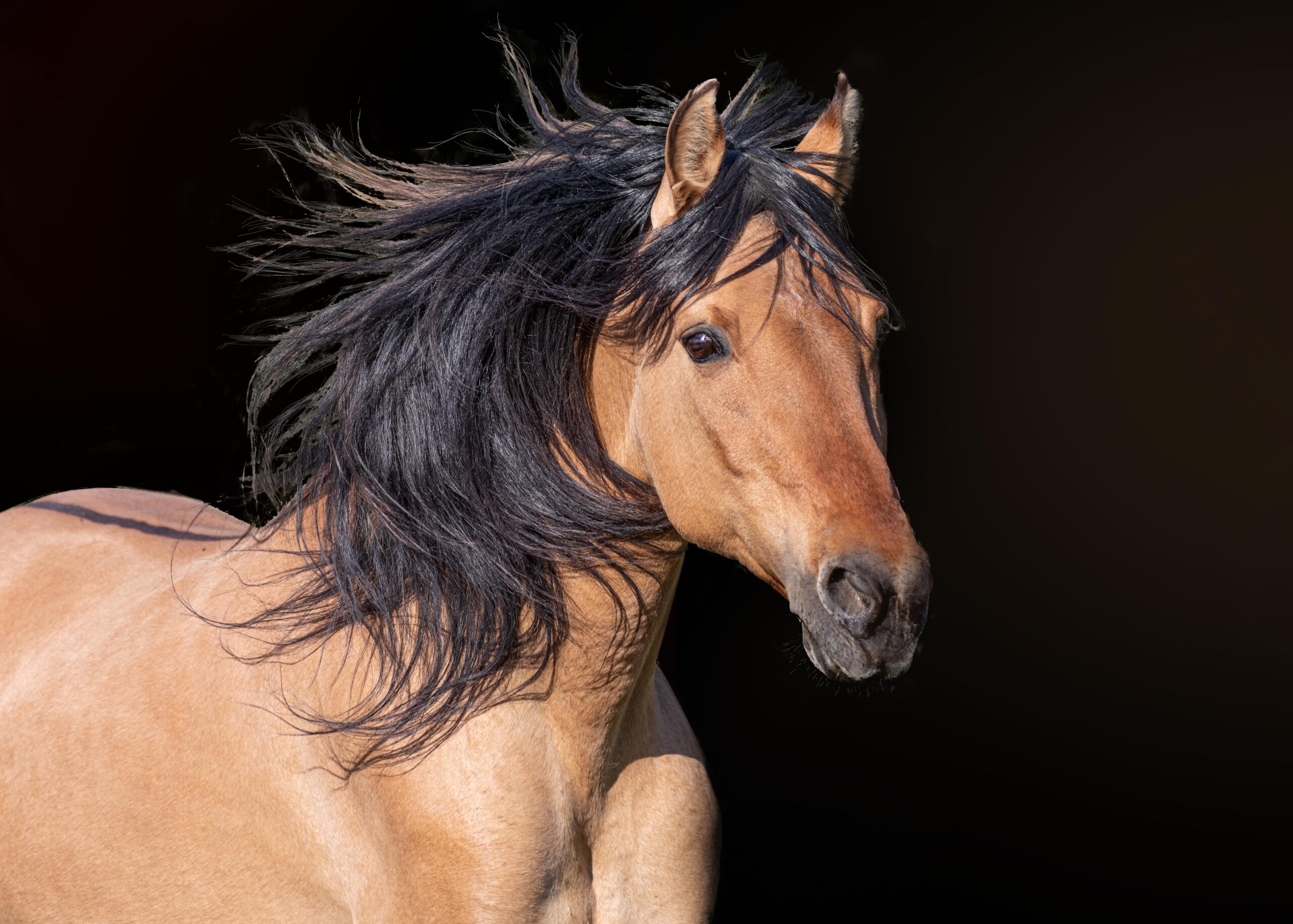 Kigers range from 13.3 to 15.2 hands. The majority are duns, but Kigers can also be other colors, including bay, grullo, red dun, roan, or black. An unusual color, termed “claybank” by the Kiger community, combines dun with cream to create the palest line-backed representatives of the breed. Some Kigers have white markings, but excessive white is discouraged.